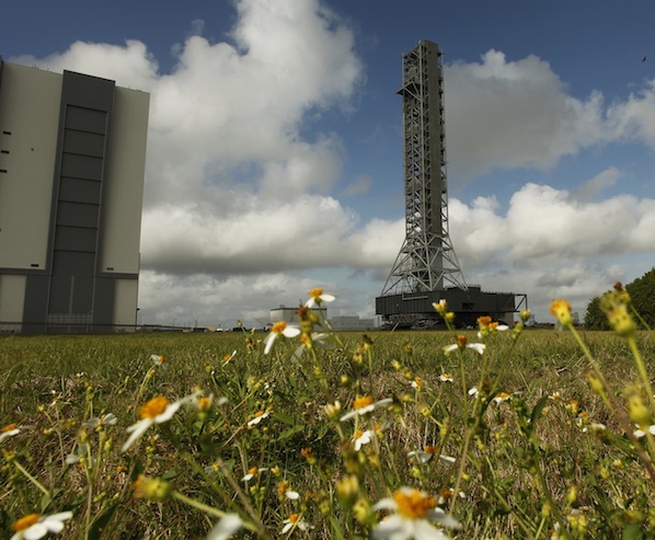 The mobile launch platform is the tallest structure to roll on top of a crawler-transporter since 1975. The tower will be used by NASA's Space Launch System, a heavy-lift rocket for deep space exploration due to debut in late 2017.
