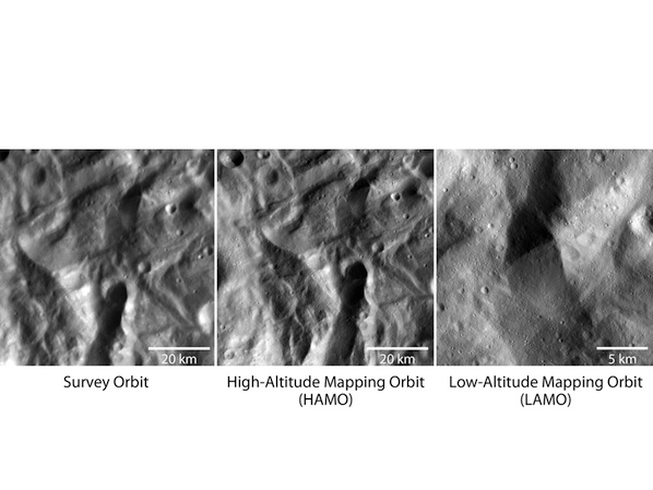 NASA's Dawn spacecraft has spiraled closer and closer to the surface of the giant asteroid Vesta. These images were obtained by Dawn's framing camera in the three phases of its campaign since arriving at Vesta in mid-2011, showing the increased resolution of the imager as the probe moved closer to the asteroid.