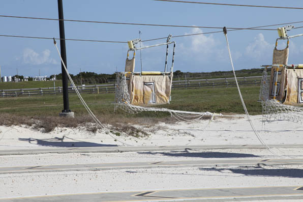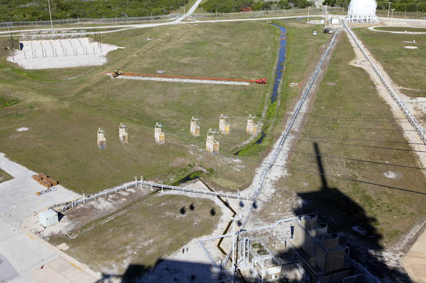 A small but visible sign of the times occurred Saturday at Kennedy Space Center's launch pad 39A when technicians removed the seven slidewire baskets that were part of the emergency escape system for space shuttle astronauts.