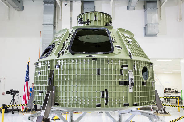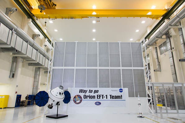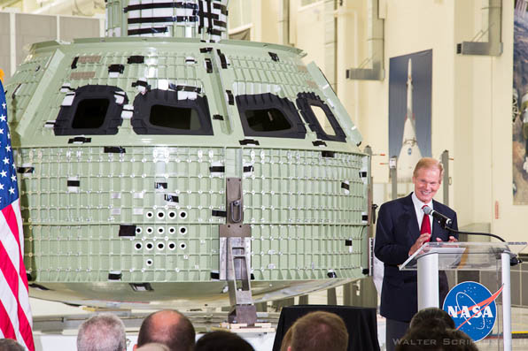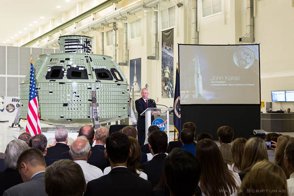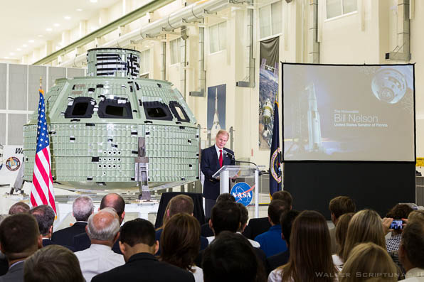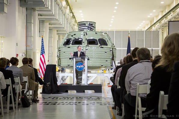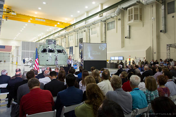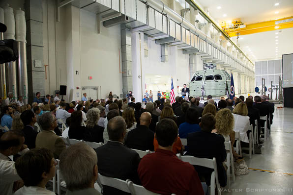 NASA officials, project management and dignitaries welcomed the first space-bound Orion space capsule to the Kennedy Space Center in a ceremony at the Operations & Checkout Building where final assembly and testing on the craft will be performed. This Orion will be sent into orbit unmanned in 2014 atop a United Launch Alliance Delta 4-Heavy rocket for a shakedown cruise.