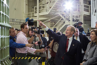 "Orion is ushering in a new era of space exploration beyond our home planet, enabling us to go farther than we've ever gone before. The future is here, now, and the vehicle we see here today is not a Powerpoint chart. It's a real spacecraft, moving toward a test flight in 2014." Sen. Bill Nelson, the Florida Democrat who has led the congressional effort to build a new heavy lift rocket that will boost Orion into deep space, said the arrival of the first capsule is a symbol of things to come. "Isn't this beautiful?" he said, standing before the empty pressure shell of the first test capsule. "I know there are a lot of people here who can't wait to get their hands and their fingers on this hardware. And ladies and gentlemen, we're going to Mars. Without question, the long-term goal of our space program, human space program right now is the goal of going to Mars in the decade of the 2030s. "We still need to refine how we're going to go there, we've got to develop a lot of technologies, we've got to figure out how and where we're going to stop along the way. The president's goal is an asteroid in 2025. But we know the Orion capsule is a critical part of the system that is going to take us there." The green interior pressure vessel that will make up the core of the first Orion capsule was delivered to Kennedy last week. Over the next year of so, engineers will attach a heat shield, install avionics systems and flight computers, along with other critical components. If all goes well, the capsule will be launched on an unmanned test flight -- Exploration Flight Test 1, or EFT-1 -- in 2014.