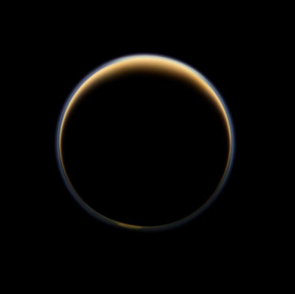 NASA's Cassini spacecraft looks toward the night side of Saturn's largest moon and sees sunlight scattering through the periphery of Titan's atmosphere and forming a ring of color. See larger image