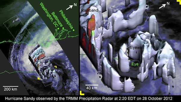 The precipitation radar on the joint U.S.-Japanese Tropical Rainfall Measuring Mission satellite provided this 3D view inside the core of Hurricane Sandy. Data for this image were collected at 2:20 p.m. EDT on Oct. 28. Credit: Owen Kelly/NASA