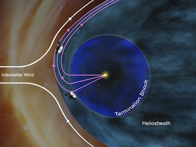 Beyond the heliosphere lies a vacuous expanse known as interstellar space, where the solar wind stops and material expelled from exploding stars hold reign. Voyager 1, the most distant human-made object, is the first spacecraft to explore the boundary region. In July and August, scientists noticed intriguing data coming from Voyager 1's particle counters as the craft flew more than 11 billion miles from Earth. "Voyager has discovered a new region of the heliosphere that we had not realized was there," said Ed Stone, Voyager project scientist at NASA's Jet Propulsion Laboratory. The instruments registered dramatic, temporary changes in the levels of cosmic rays and low-energy particles two times in late July and mid-August. On Aug. 25, Voyager 1 detector sensed a permanent rise in high-energy cosmic rays, just as the probe's telescopes a sharp drop in low-energy particles coming from inside the heliosphere. Scientists believed cosmic rays, which originate from outside the solar system, would not penetrate the heliopause, the border where the heliosphere and interstellar space meet. And researchers thought low-energy particles from the solar system would be constrained inside the heliosphere. "If we had only looked at particle data alone, we would have said we're out. Goodbye, solar system," said Stamatios Krimigis, principal investigator of the low-energy charged particle instrument, based at the Johns Hopkins University Applied Physics Laboratory. But scientists instituted a third test to check whether Voyager 1 had crossed the heliopause and left the solar system. Inside the heliosphere, the magnetic field is oriented in an east-west direction due to the spinning of the sun. Outside, scientists say, evidence points to the magnetic field being in a north-south direction. So far, Voyager 1 has not recorded a change in magnetic field direction, according to Leonard Burlaga, a Voyager magnetometer team member based at NASA's Goddard Space Flight Center.