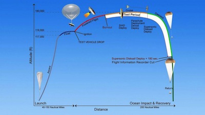 At that point, the LDSD was to be released. After small rocket motors fire to spin the vehicle up for stability, an ATK Star 48 solid-fuel rocket motor was programmed to ignite to accelerate the test article and boost it an additional 11 miles to some 180,000 feet, or 34 miles. Flying at more than four times the speed of sound, the flight plan called for the heavily instrumented SIAD torus to inflate, expanding the diameter of the entry vehicle from about 15.4 feet to 19.7 feet. After slowing to about 2.5 times the speed of sound, the parachute was expected to unfurl to a diameter of 110 feet, quickly slowing the craft even more. "What we're trying to do is replicate the environment in which these technologies would be used," Clark said. "That means replicating the atmosphere, in particular the density of the atmosphere, which at Mars is extremely thin. To find (those conditions) we have to go halfway to the edge of space, or about 180,000 feet here on Earth, to test these devices. And we have to go several times the speed of sound." Four Go-Pro video cameras were on board to provide realtime coverage of the SIAD inflation and parachute deploy. Video from higher resolution cameras will be stored on board and recovered after the test vehicle splashes down in the Pacific Ocean at the end of its flight. Mission duration, from balloon launch to splashdown, was expected to be about three hours. "This is our first experimental test flight of this vehicle that is designed to carry the SIAD and the parachute to the proper conditions very high in Earth's atmosphere and very fast so that it looks like, to these articles, that they're flying at Mars," said Mark Adler, LDSD project manager at JPL. "So we test them in those conditions at full scale to make sure they're going to work at Mars." The SIAD torus initially was tested at the Naval Air Weapons Station at China Lake, Calif., using a rocket sled to accelerate the device to several hundred miles per hour. To test the parachute, a long cable was connected, fed through a pulley system and attached to a rocket sled. The parachute then was released from a helicopter, the rocket sled was fired up and the parachute was pulled toward the ground with a force equivalent to about 100,000 pounds of drag.